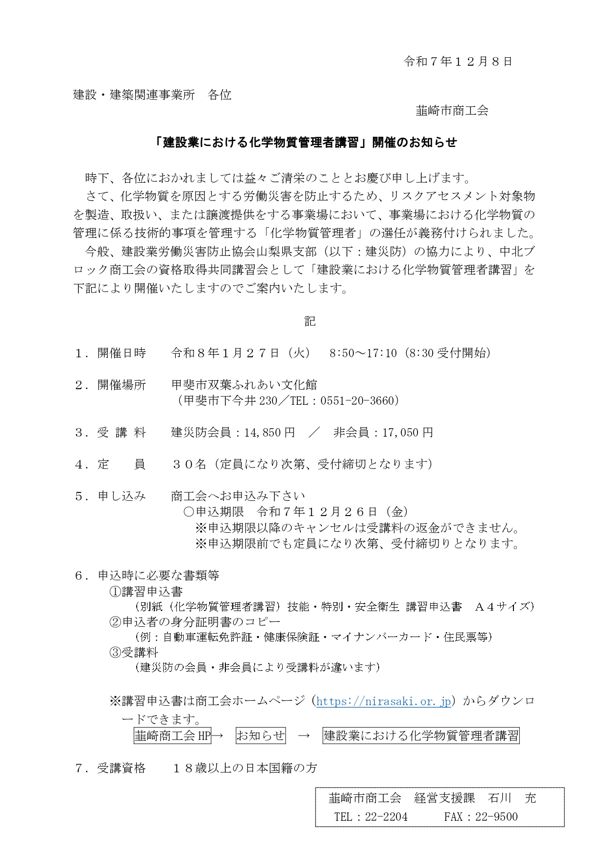 ※通知文をクリックするとダウンロードできます 申込書はこちら↓ 化学物質管理者講習会申込書_PDF 化学物質管理者講習会申込書_Word